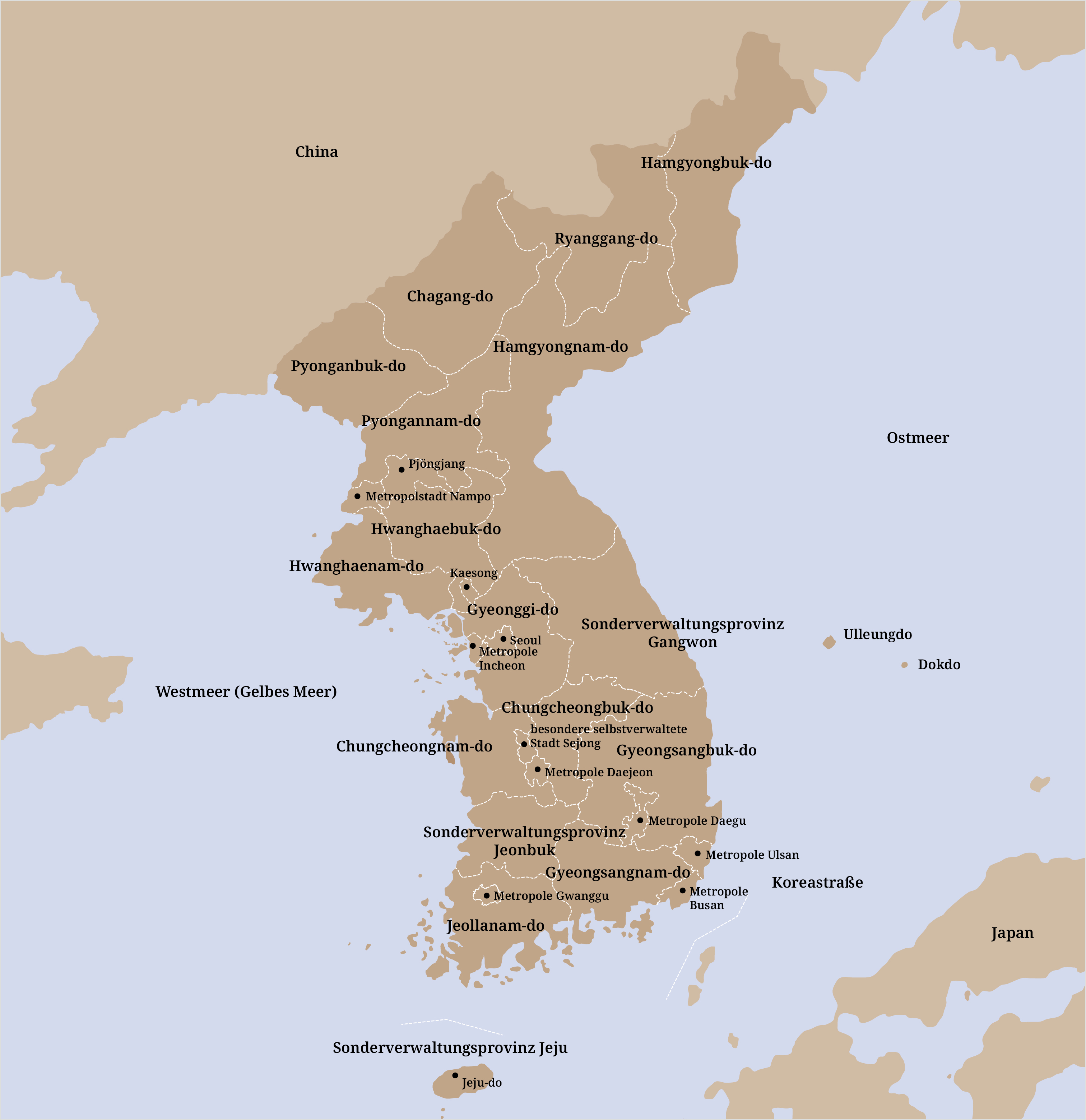 Insbesondere im Zuge der demographischen Veränderungen und der Industrialisierung wurden die großen Städte als eigenständige Metropolstädte ausgegliedert. Jeju (2006), Gangwon-do (2023) und Jeonbuk (2024) wurden zu Sonderverwaltungsprovinzen umgewandelt. Diese Reformen spiegeln die regionalen Besonderheiten und den jeweiligen Verwaltungsbedarf wider.