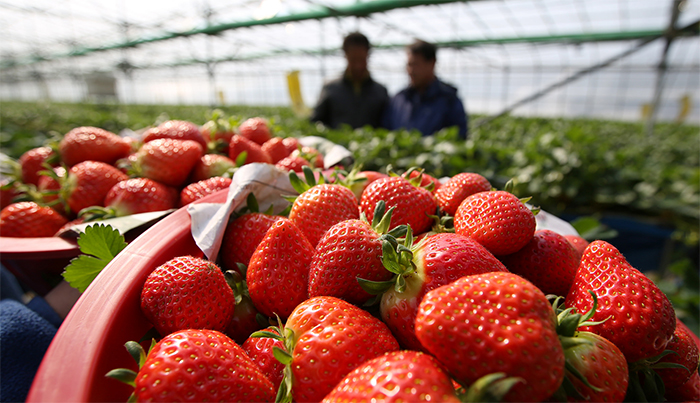 Koreanische Erdbeeren werden voraussichtlich schon bald nach Vietnam exportiert. Das Bild zeigt die Erntesaison in einer Erdbeerfarm im Landkreis Hamyang-gun in der Provinz Gyeongsangnam-do.